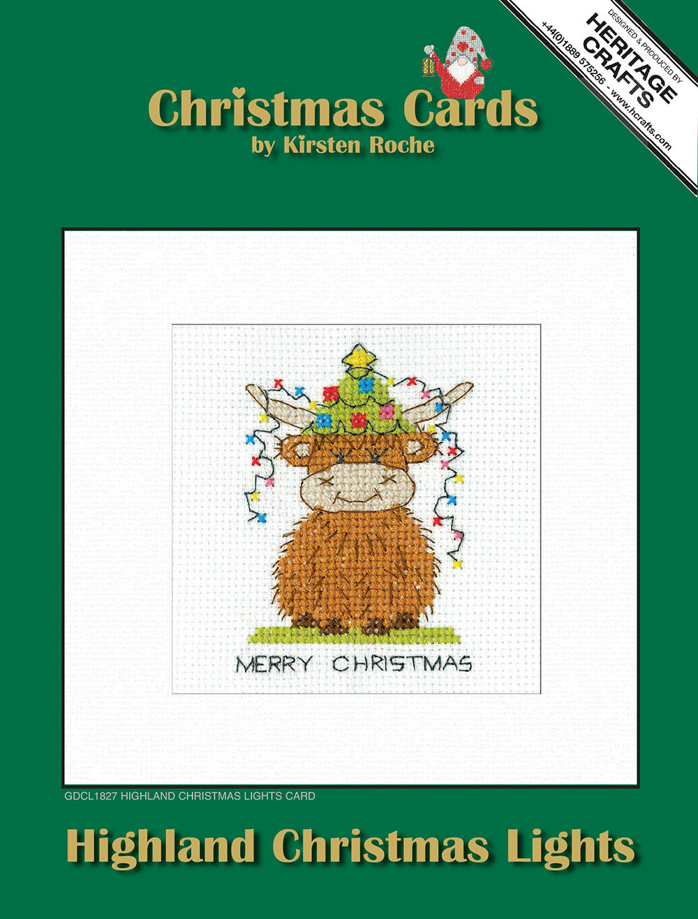 Highland Christmas Lights - Highland Cow Christmas Card cross stitch kit from Heritage Crafts
