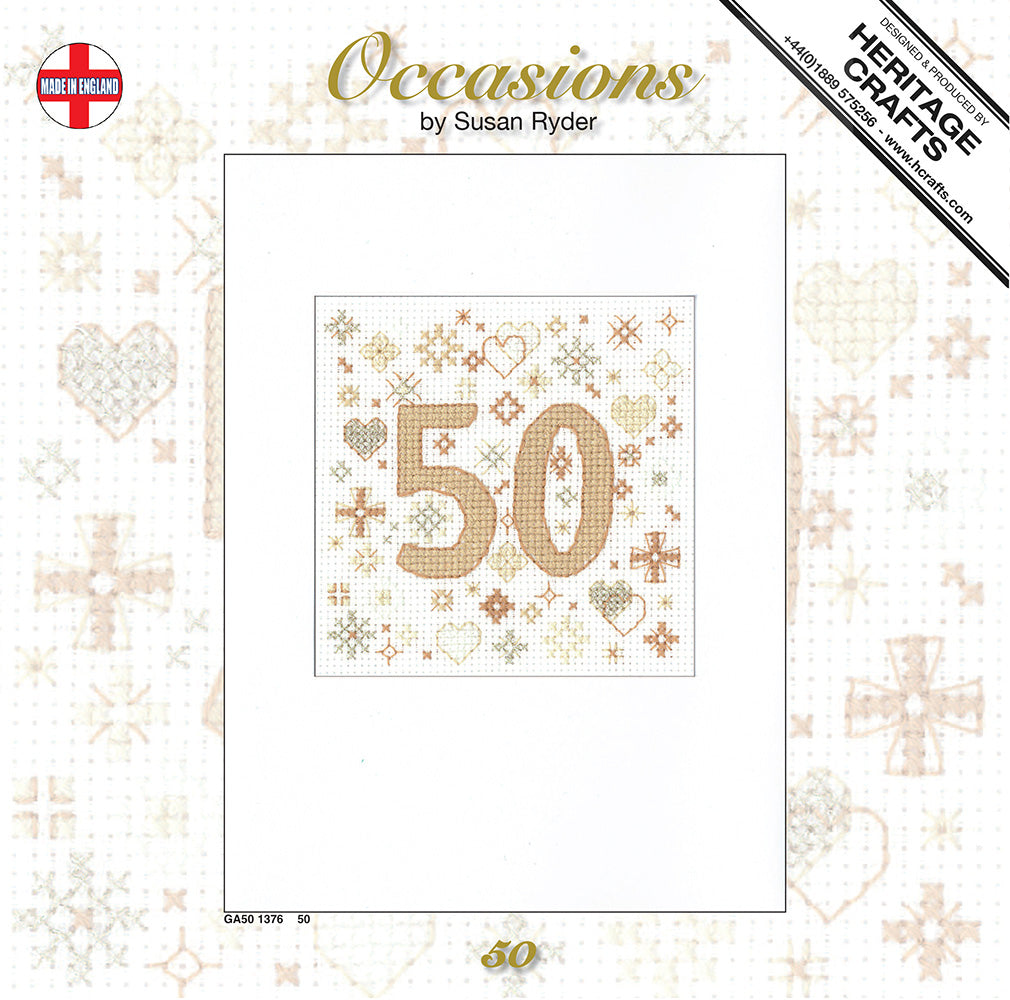 Occasions 50th Greetings Card cross stitch kit by susan Ryder for Heritage Crafts